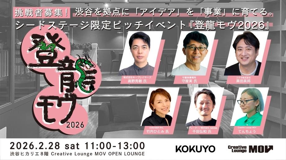 『登龍モヴ2026』は、シードステージに限定したピッチイベントで、アイデアを事業へ発展させたい起業家を対象としています。開催に先立ち、2025年12月3日(水)から2026年1月26日(月)まで登壇者の募集が行われます。